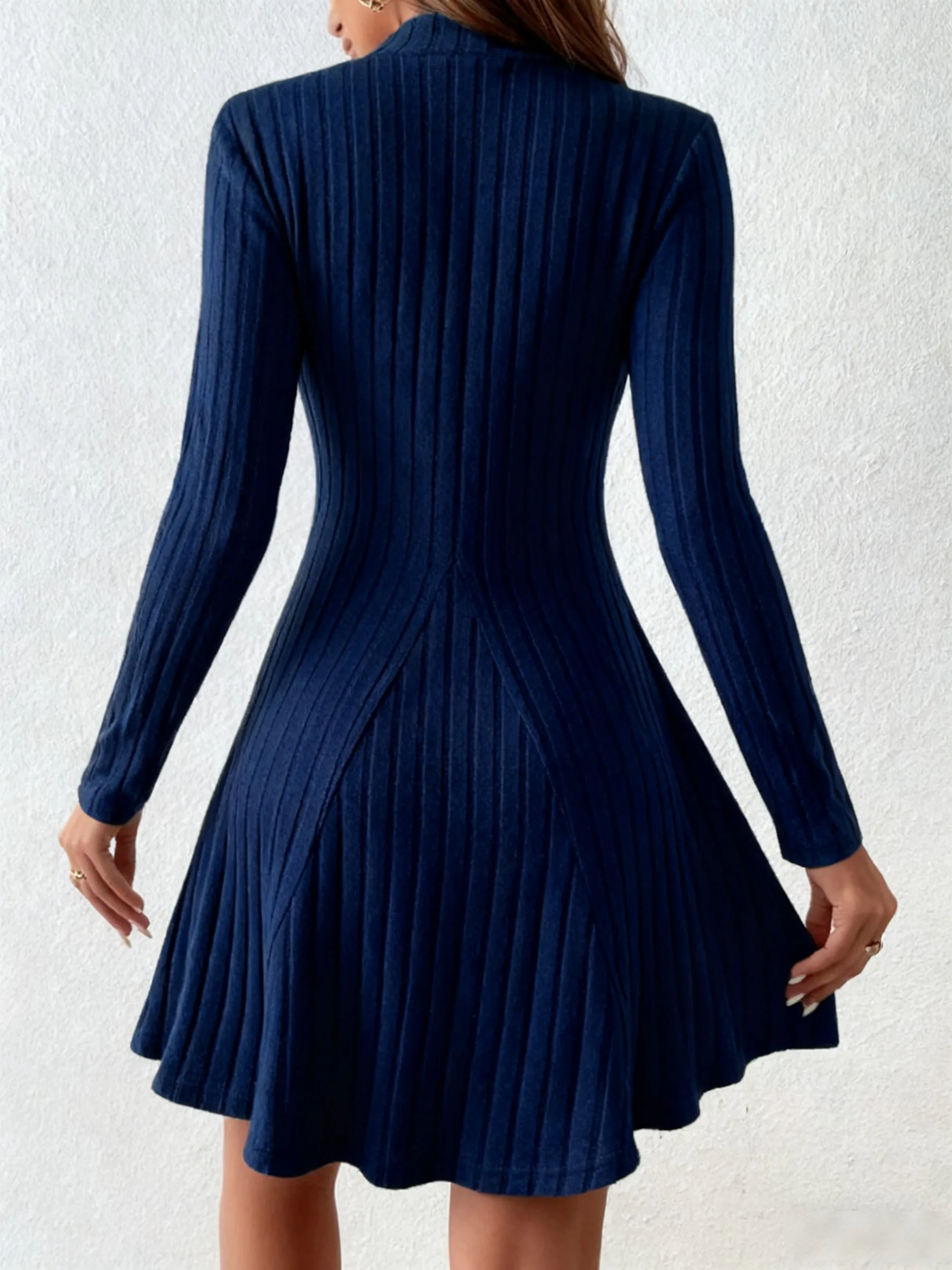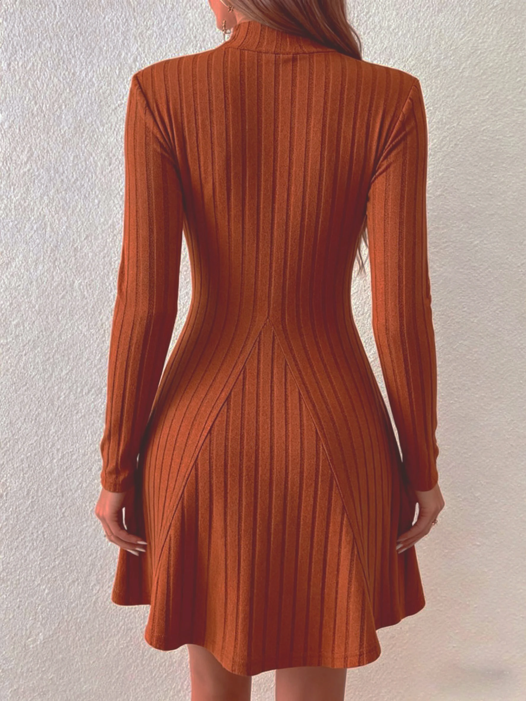 Vestido Curto Canelado Manga Longa Gola Alta Elegante